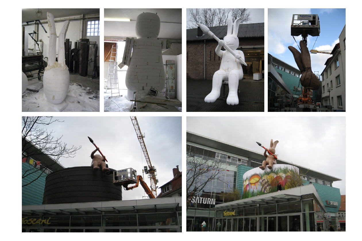 Anfertigung einer Großplastik als Osterdekoration für ein Einkaufszentrum. Der Hase hat eine Gesamtlänge von sechs Metern. Der Kopf ist für den Transport und die Aufstellung abnehmbar.